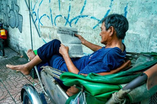 That’s certainly what happens to me as I wander Cholon’s back streets. I stop for another coffee next to a tiny neighbourhood pagoda; an old man invites me into his house for a cold drink; a salt trader insists on being photographed cradling a bag of his produce like a newborn infant; I have a long chat with an elderly cyclo driver who I interrupt reading the newspaper; a security guard at a pagoda sports an increasingly rare example of the lucky hairy mole. Such are the benefits of getting off the tourist trail, getting lost, and wandering around smiling at everyone.
